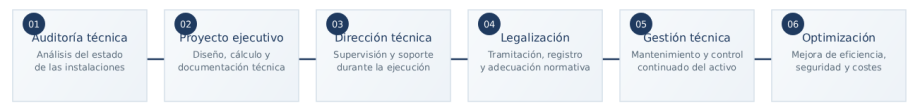 Es una estructura técnica especializada que integra: Diagnóstico técnico, Proyecto ejecutivo MEP, Dirección técnica, Legalización e inicio de Actividad, y Gestión técnica continuada.